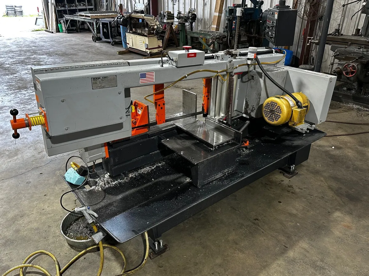 HEM Sidewinder M, a used horizontal band saw. Features a 12.75" height and 16" width rectangular capacity, powered by a 3 hp motor. Equipped with a 1" wide, 0.035" thick, and 162" long blade. Ideal for precision cuts.